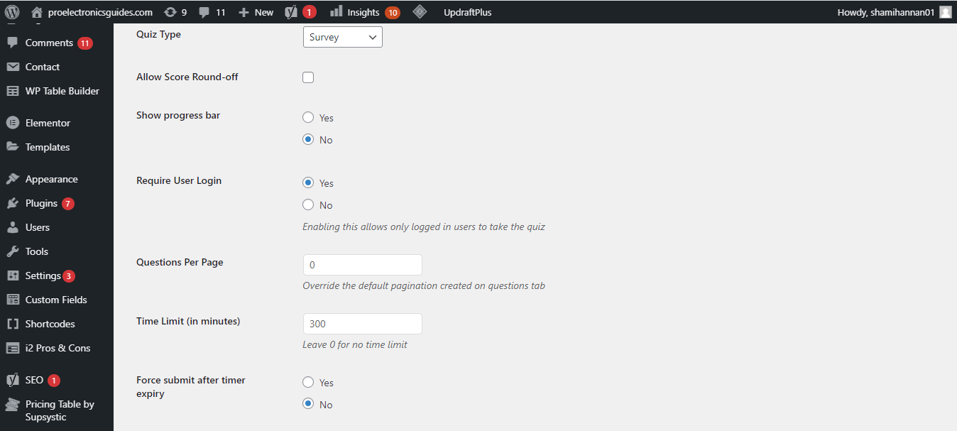 Configure the quiz or survey form in the options tab and customize it as per your requirements. You can set a time limit, control the number of questions per page, and a few other settings.